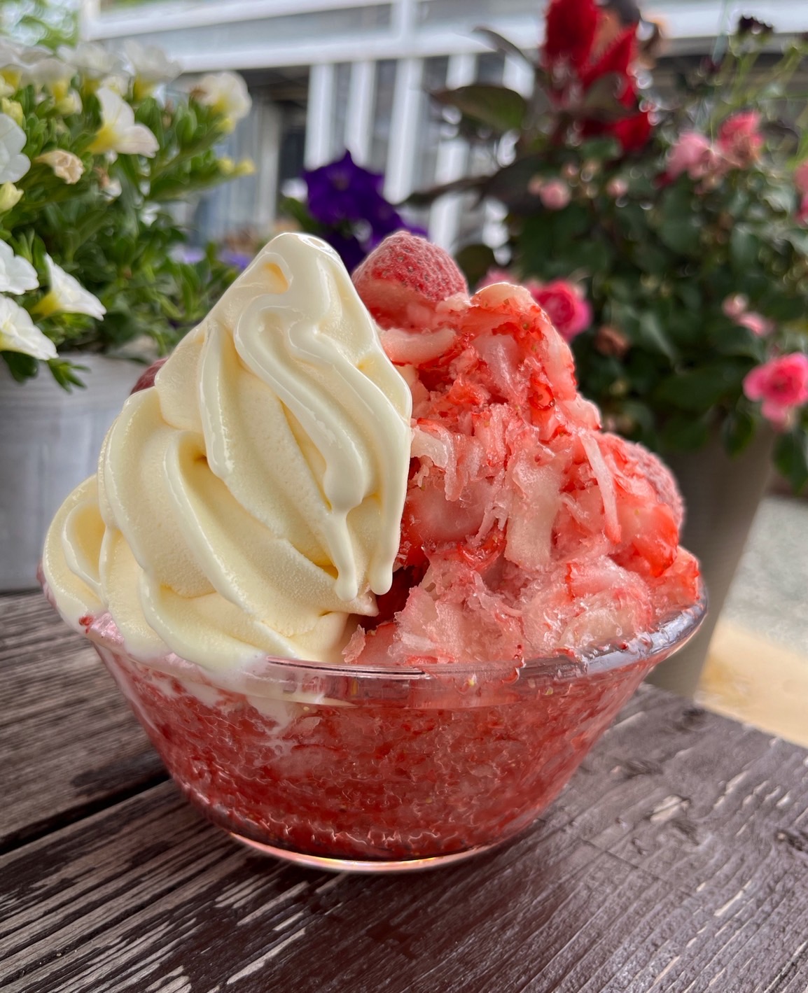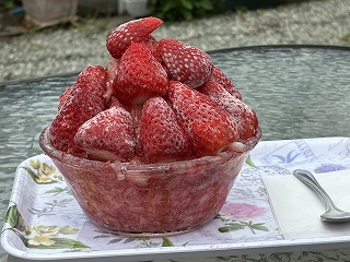 急冷苺を削るかき氷に急冷した大きいイチゴをトッピングしています.